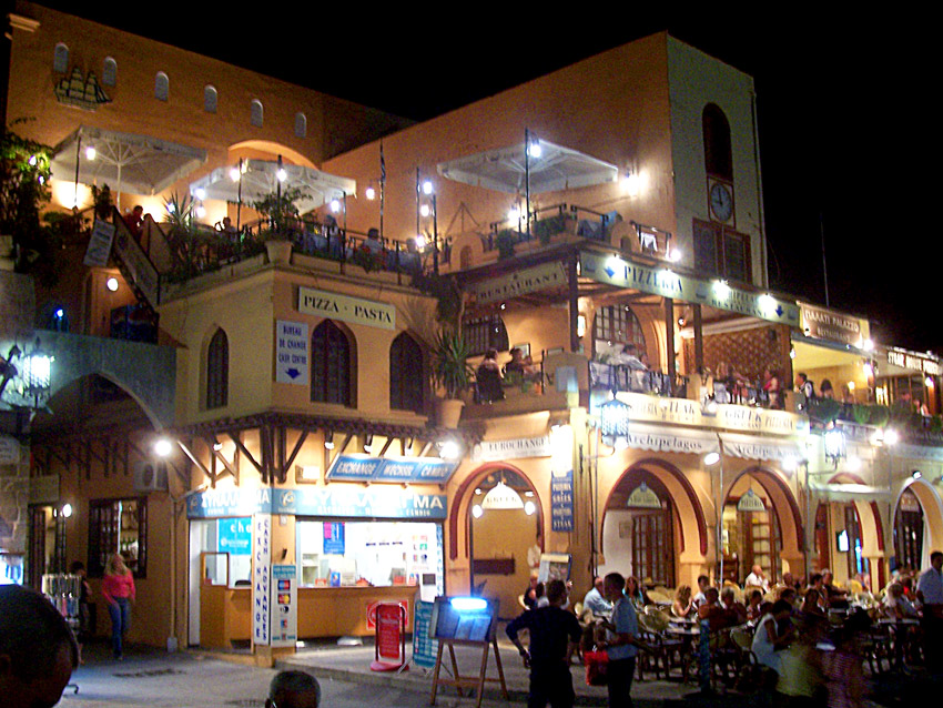 The taxi from the airport was 12 euros and dropped me off at my hotel, located on Orfanidou Street in the new part of the city. (Rhodes is divided between the newer city and the Old Town, which is entirely inside encircling medieval walls) It was evening and thousands of people were out in the streets...going to bars and clubs, sitting in outdoor restaurants, and enjoying the generally festive atmosphere that pervades the island during the summer months. My first impression was that Rhodes offers every single thing a tourist would ever need. Within a two minute walk from my hotel there were beaches, tons of restaurants, nightclubs, internet cafés, stores, and anything else I could think of. Yet still the feeling was distinctly that of a Greek island; flowering trees and bougainvillea along the streets, everyone eating at outside tables, and a casual, friendly vibe.