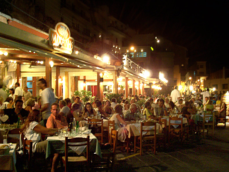 The festive atmosphere in the Old Town extends well into the evening, but late night activity has its hub on Orfanidou Street in the new town, unofficially called "Bar Street". There are dozens of nightclubs and bars along its length, most of them with fronts that open to the street with people spilling out. Crowds of visitors pack the length of it as they pass from one bar to the next, or just stand around hooking up with each other. You'll find good DJs and even live bands at the larger venues, so walking down the street is like moving the dial across a radio, getting a brief sample of all kinds of music as you move forward.