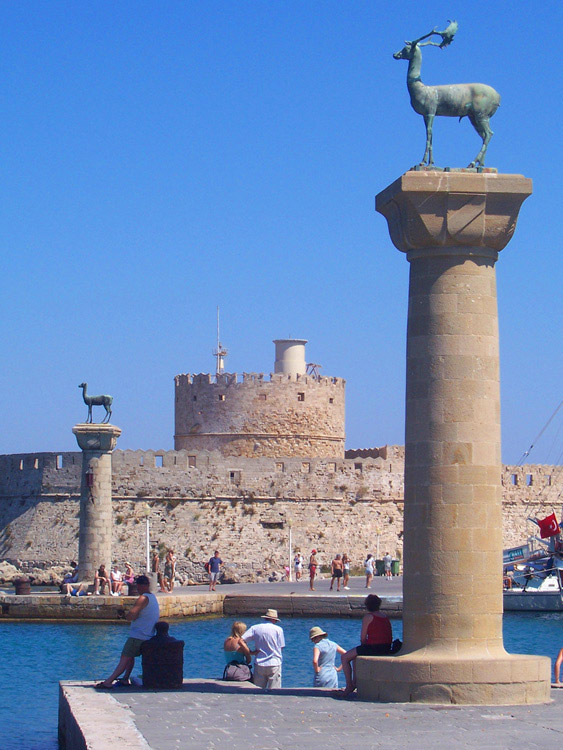 It was exciting for me to arrive in Rhodes for the first time, because I had already read so much about this island. It's reputed to be a perfect combination of sun, sea, and picturesque towns. I stepped off the plane and noticed the green forested hillsides rising near the airport. I had been visiting several Cycladic islands, which by August have been mostly baked to a golden crisp, so this vision of greenery was something different. My plan was to spend two days in Rhodes Town, at the northern tip of the island, followed by three days in Lindos, the relaxing little seaside village in the south.