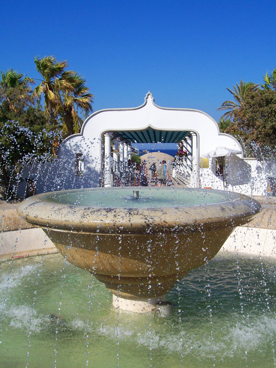When you approach the entrance there's an attractive water fountain and a trellised walkway that leads down to the sea. Descending some steps, you see a domed structure surrounded by palm trees, where the spa waters use to fill the covered seating area. It's dry nowadays, but still a nice place to sit in the shade or snap a few pictures. Directly beyond is the small beach, and beyond that some areas along both sides of the cove where people sunbathe and swim. When I returned two years ago, the entire area had been renovated. A comfortable bar/restaurant is embedded into the rocky ledge on the side of the cove, and on the hill above is a nicely renovated spa building. Anyone visiting Kallithea should take the short walk over the hill and go into this building for a sublime experience.