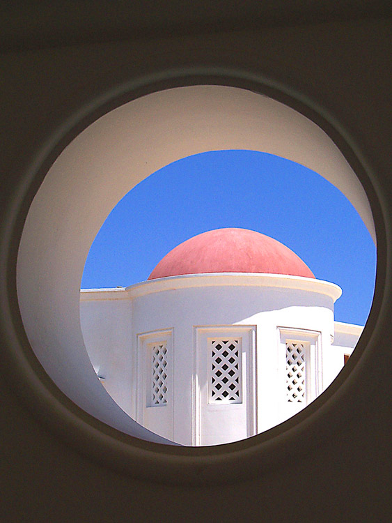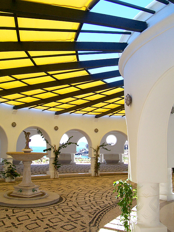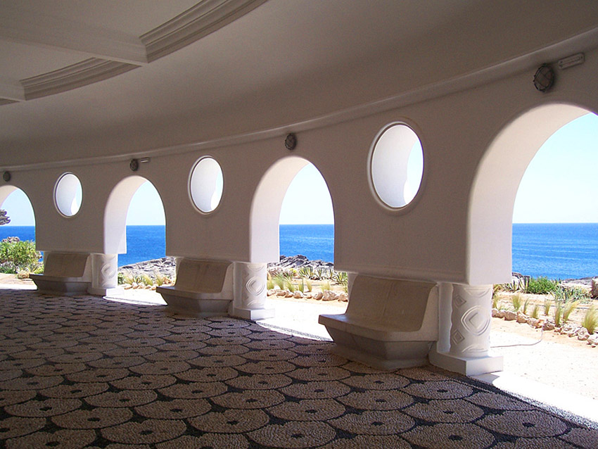 It's a round structure with some smaller buildings attached, all built in a manner that's very congruous with the landscape. Inside, you can walk around, look at some art, or have a rest on one of the benches that overlook the sparkling sea. Don't miss the film stills and historical photos they have hanging on the walls, showing the place during it's glamorous heyday of the 1920's, when wealthy travelers and celebrities escaped here.